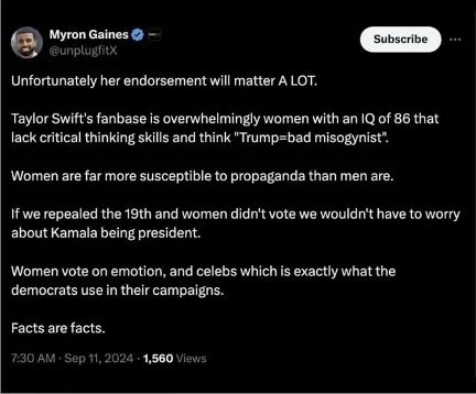 On February 10, 2025, Melissa Deckman published an Op-Ed on The Hill outlining that Gen-Z men voted for Donald Trump largely due to an increasing rightward shift in young men caused by a growing fear that feminism and DEI policies will exclude them from employment opportunities (Deckman, 2025). Such concerns have also caused men to gravitate towards far-right “manosphere” influencers like the aforementioned Andrew Tate and Myron Gaines in a misguided effort to regain their masculinity.